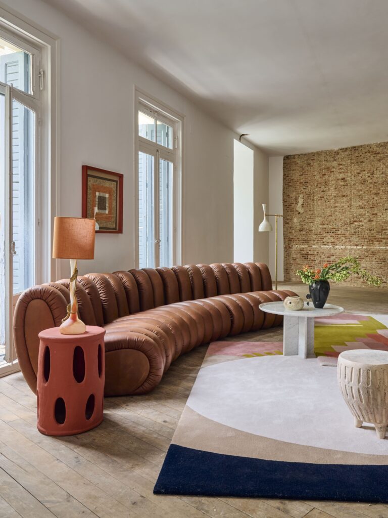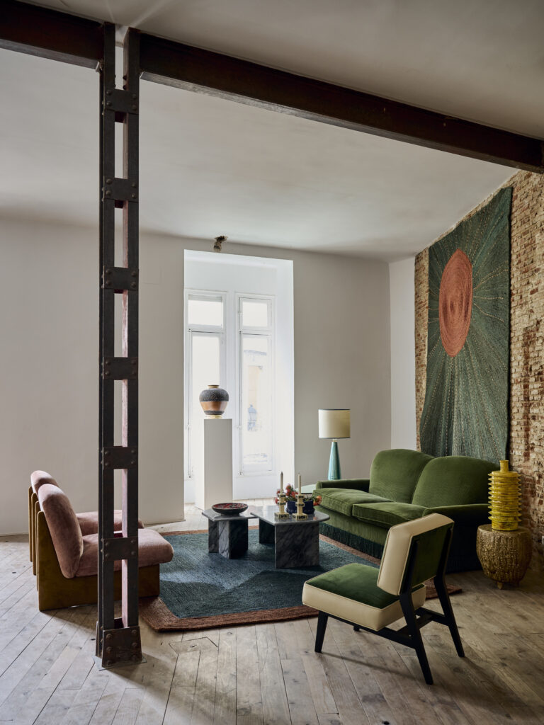 La calidez de los tonos tierra se impone en una tercera escena, donde las butacas Aretha en terracota y Julie en negro crean un juego de volúmenes sobrio pero contundente. Finalmente, el sofá Dalida y la butaca Shirley, en un profundo verde bosque, completan un entorno lleno de texturas y matices, donde cada pieza invita a quedarse y observar.