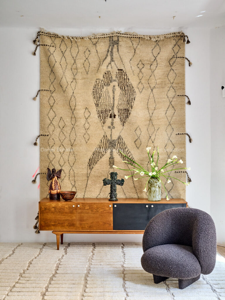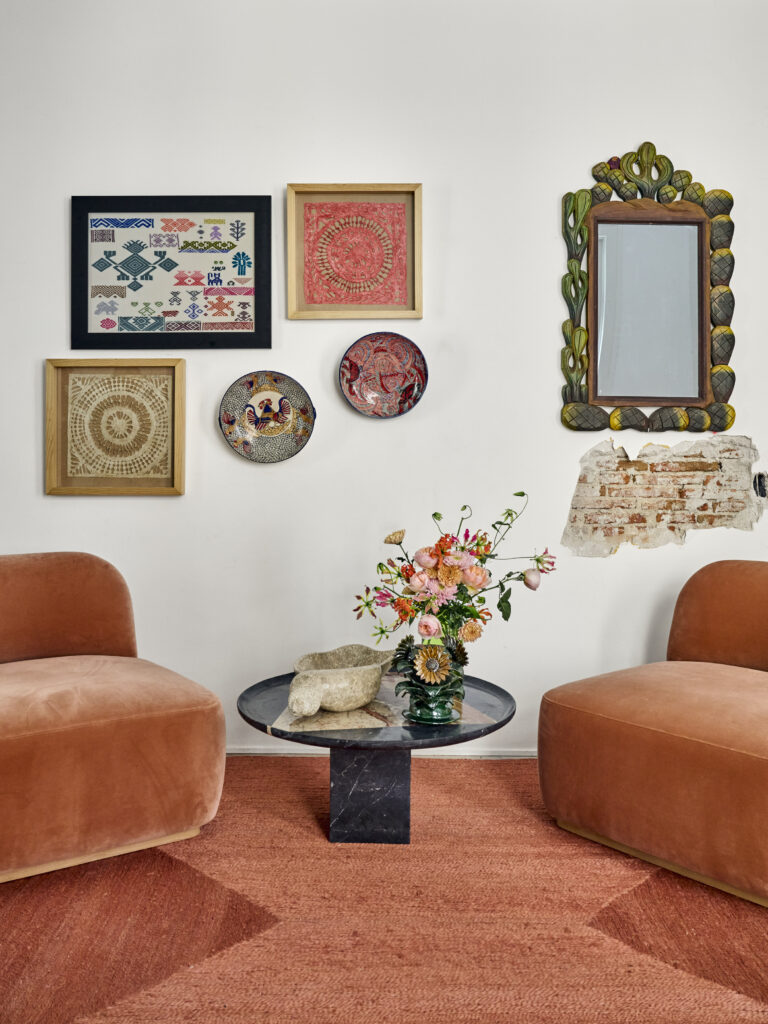 Nuestros muebles artesanales dialogan con barro, vidrio soplado, lana, textiles teñidos a mano y piezas antiguas. En un primer ambiente, el sofá Tina, de cuero marrón y estructura tipo acordeón, toma protagonismo frente a una pared de ladrillo visto, resaltando su carácter escultórico. En otro rincón, la silla Woody se cruza con elementos de tradición mexicana, generando un contraste vibrante entre el diseño contemporáneo y la artesanía ancestral.